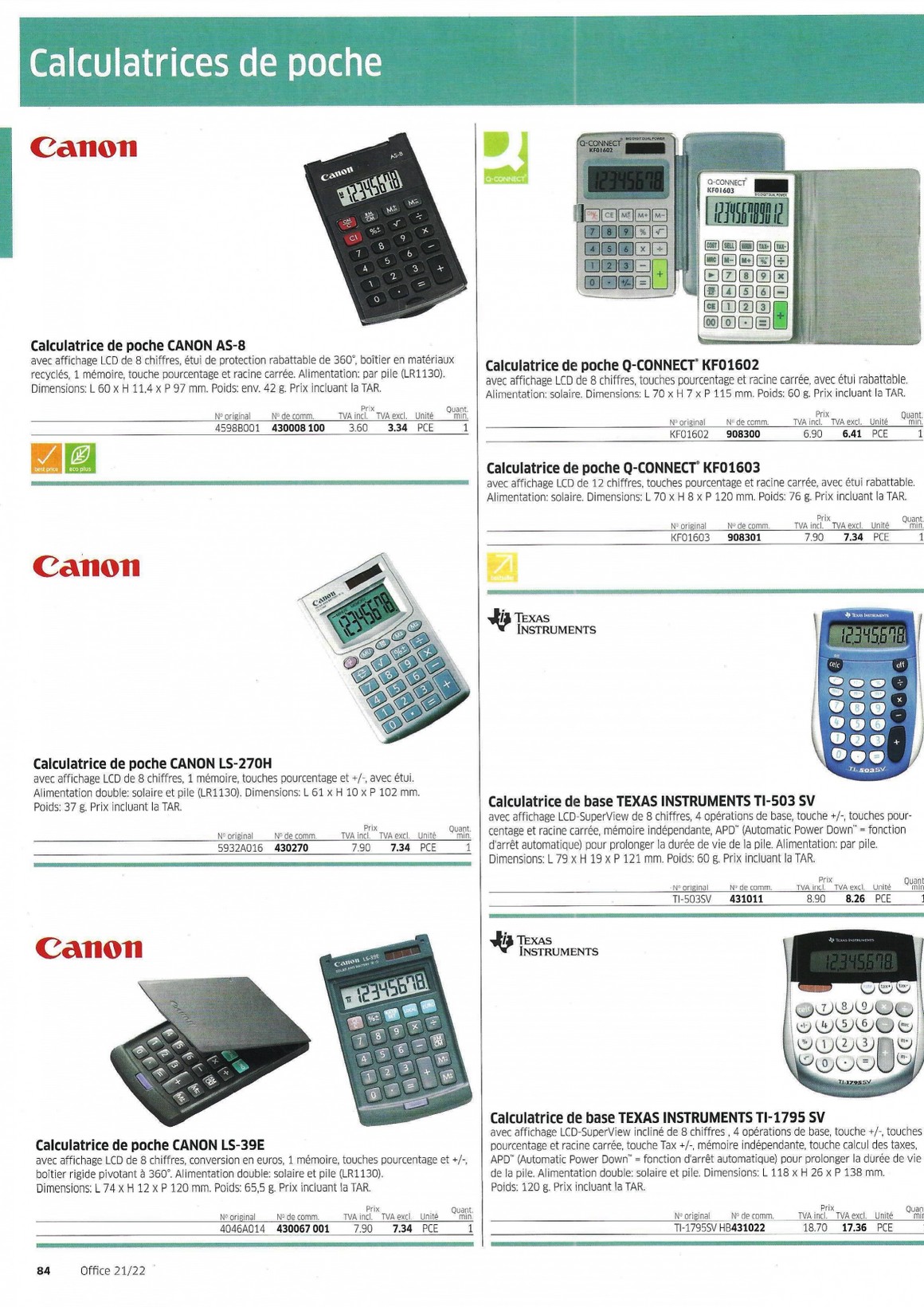 Catalogue 2021-22 > 1 Appareils de bureau Consommables Informatique EDP 10-90 > Calculatrices 84-90